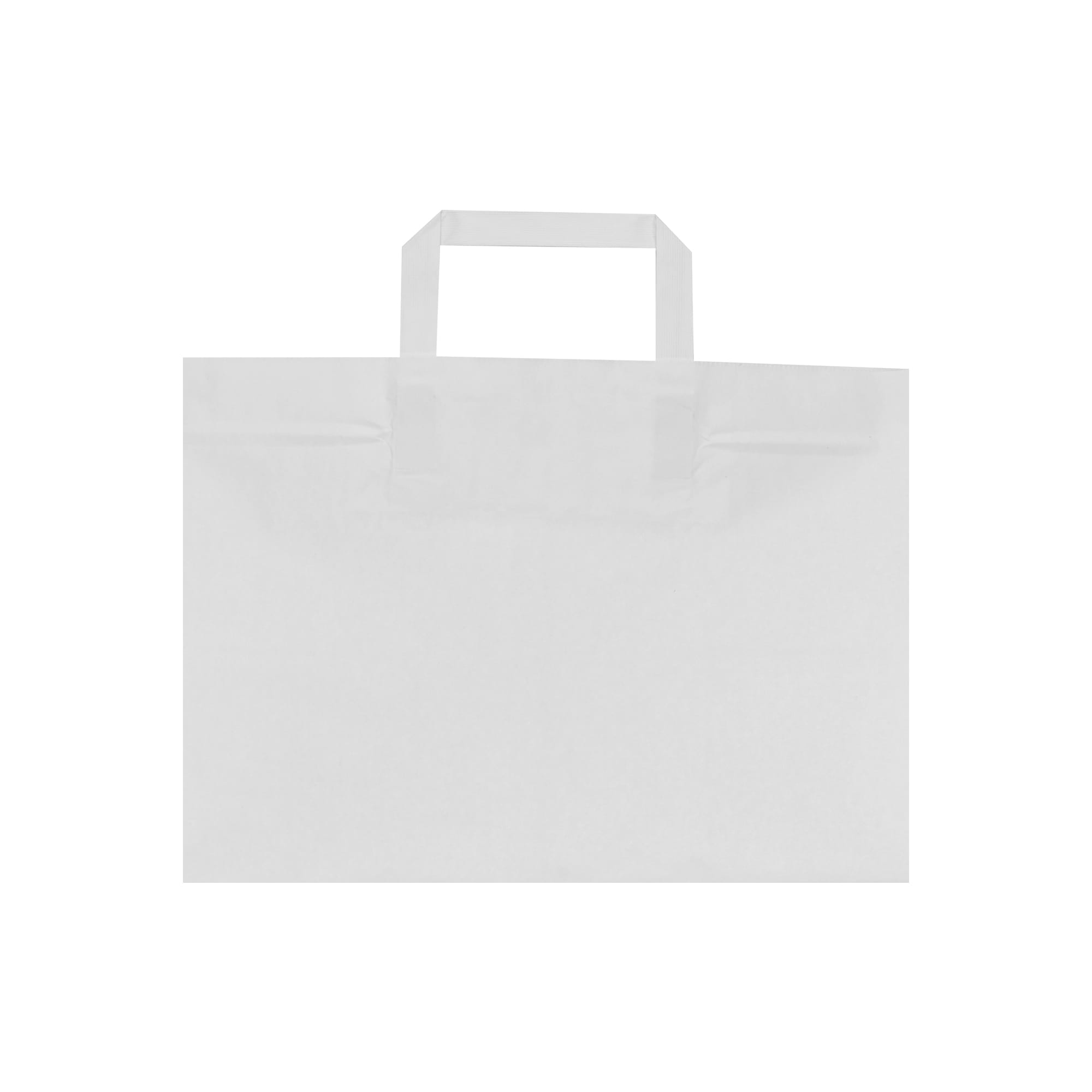 Mânerul lor, de tip plat obținut din hârtie, este prins printr-o bandă de hârtie, lipit în interiorul sacoșei, oferind astfel un aspect elegant, dar și siguranță în transportul produselor cu o greutate de până la 4kg. Au un design care facilitează menținerea formei stabile pe suprafața de lucru, chiar înainte de a fi utilizate, datorită burdufului, care este lat și care conferă echilibrul necesar manevrării pe întreaga perioadă de depozitare a produselor selecționate.